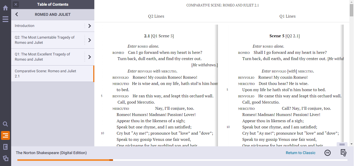 Any purchase of the Norton Third Edition includes a unique registration code to access and download the digital edition. And as someone who’s been combing through the content for the better part of four hours, let me tell you, that it is absolutely worth it. Norton has brought Shakespeare into the digital age. Of course, all of the texts have been available online since the advent of the internet, but never like this. Norton’s Bookshelf application provides the user with an absolutely dizzying array of features, all (somehow) without sacrificing that clean, beautiful interface that keeps the wonder intact. With the digital edition you get not two versions of Hamlet, but four. You can look at the different Quarto pages of Romeo and Juliet side by side. You can even click on First Folio facsimiles, voice recordings, and pertinent performance notes, all tucked neatly in the margins. You can click on troublesome words for definitions, you can take notes and place bookmarks and highlight in three different colors. Don’t want to do any of that? You can hide it all have nothing but the words on a plain white screen if you feel your wonder starting to waver.